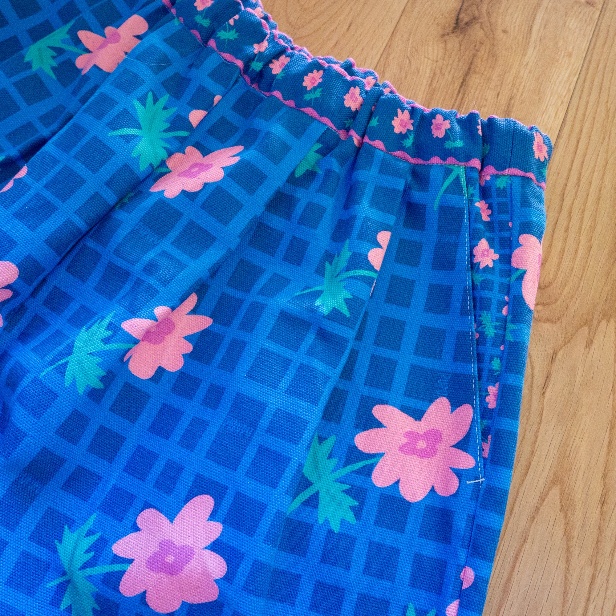 半分くらいから、花とチェックの大きさを変えてユニークさをプラスしています。